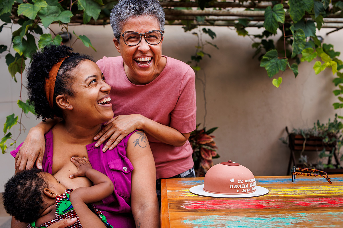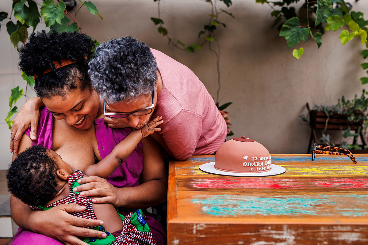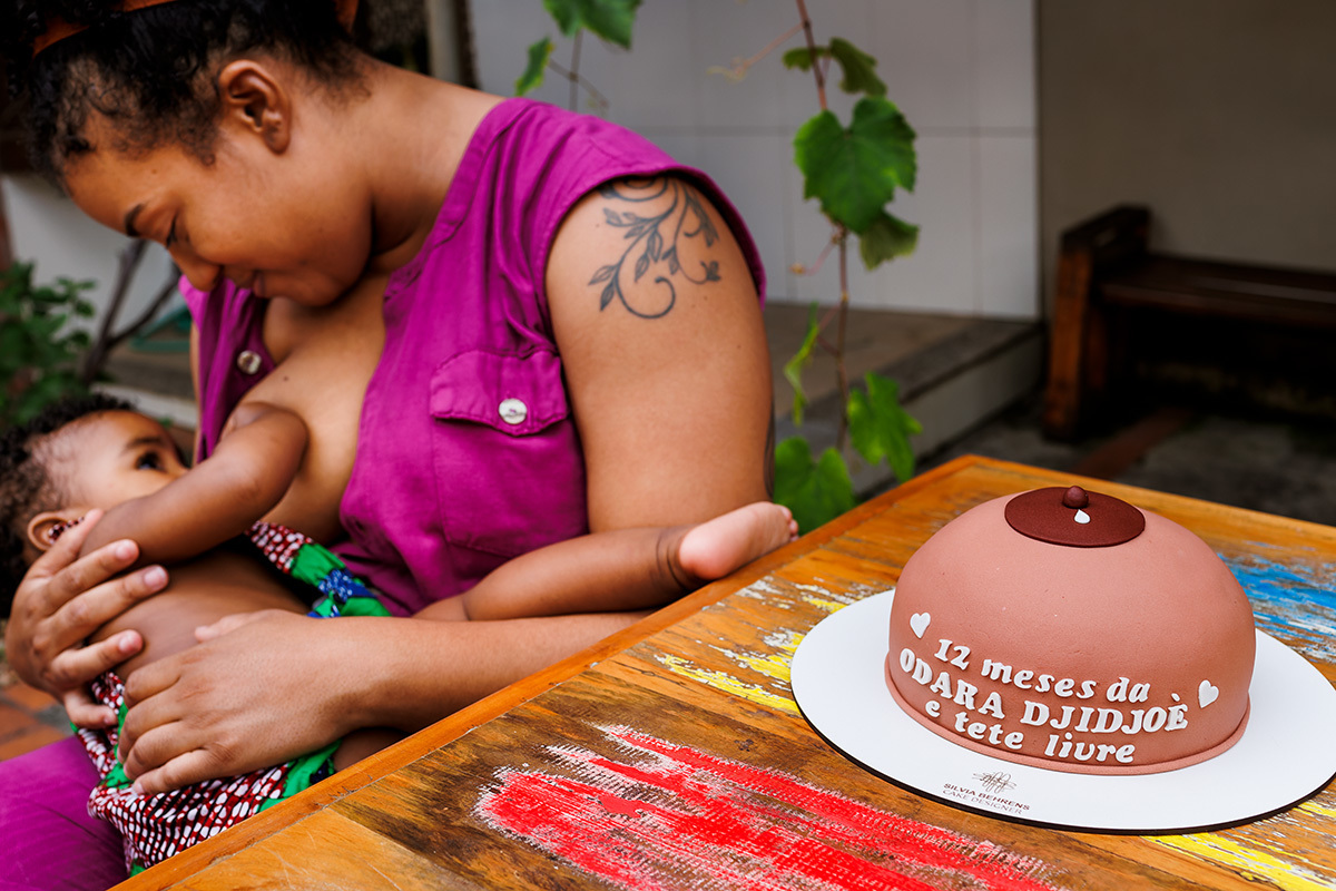 A May fez em cada mês ao longo desse primeiro ano um bolinho comemorativo, cada um com um tema. O de 12 meses foi para celebrar os 12 meses de amamentação. Depois de 6 meses já houve a introdução alimentar, mas desde que a Odara nasceu o aleitamento foi exclusivo com o leite materno. E tem que comemorar mesmo, pois a May que é obstetra e trabalha em algumas noites de plantão fez questão de sempre recolher o seu leite para os momentos de sua ausência, quando ele era dado na colherzinha a Odara pelo pai. Não foi fácil, mas ela vibra por ter conseguido, por saber da importância disso para sua filha!