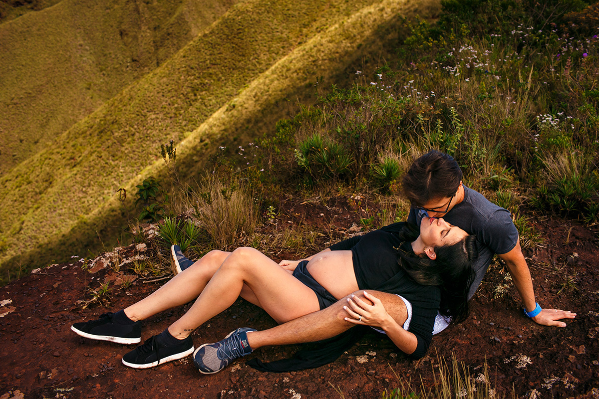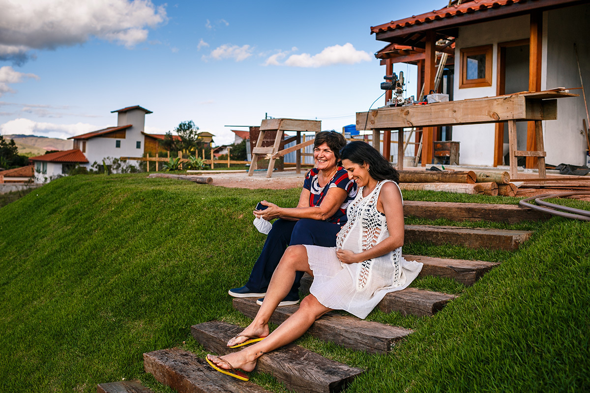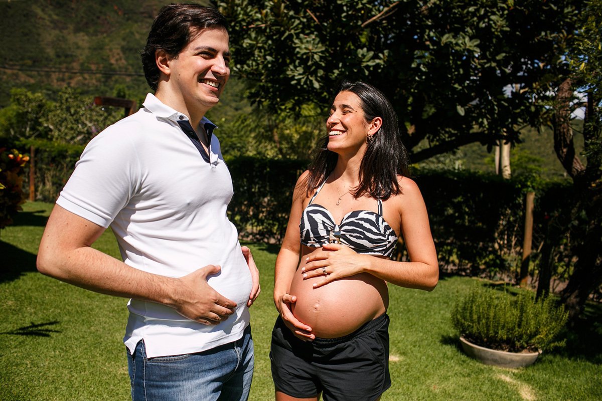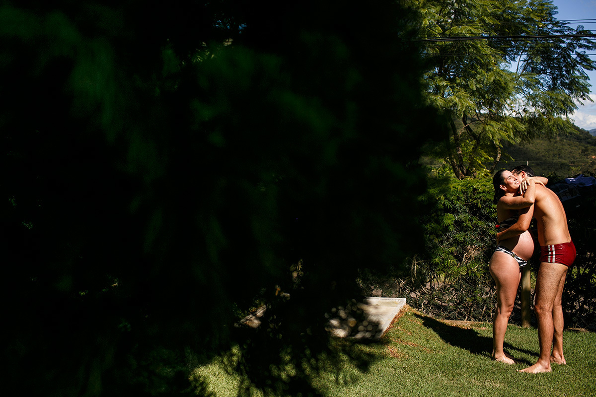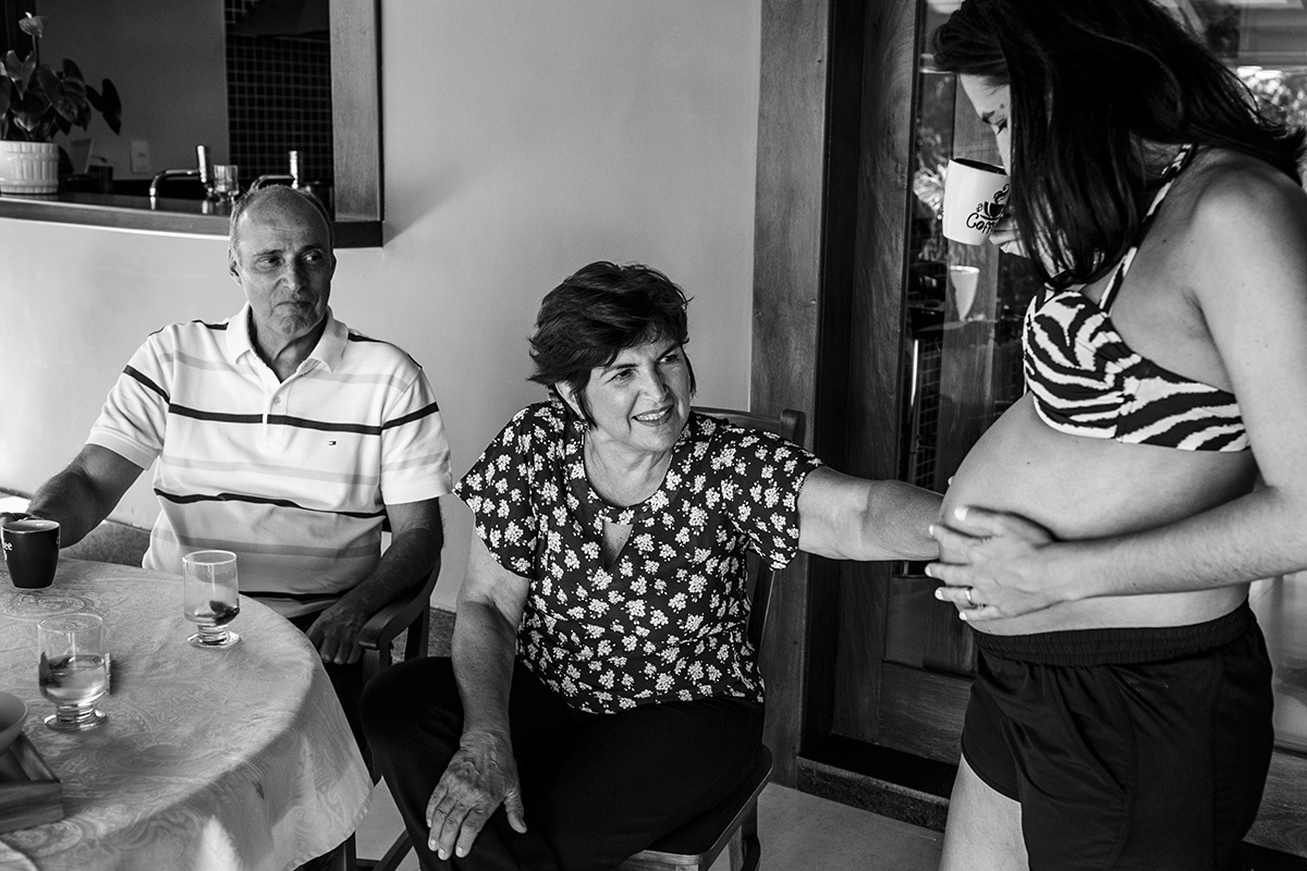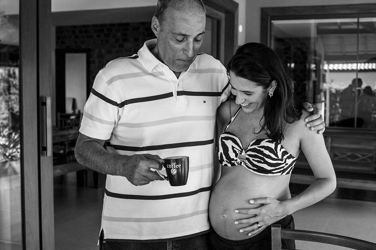 Não me preocupo muito com poses perfeitas, mas sim em deixar para a família um pouco de como eles são, do que eles gostam e de como se sentiam neste momento, para que possam olhar para essas imagens e se reconhecerem nelas. Mostrar para essa menininha que está chegando como seus pais adoram se abraçar. Como eles adoram curtir a varanda da casa deitados no colchonete, ali mesmo, no chão. Como se enroscavam no sofá para lhe contar um segredo. Como sua mãe sorri até com os olhos só de se aproximar do seu pai. Mostrar para essa menininha que está chegando o grande amor que seus pais e seus avós já sentiam por ela quando ainda estava dentro da barriga. Mostrar para ela que muito do que importa está nestes momentos simples da vida.
