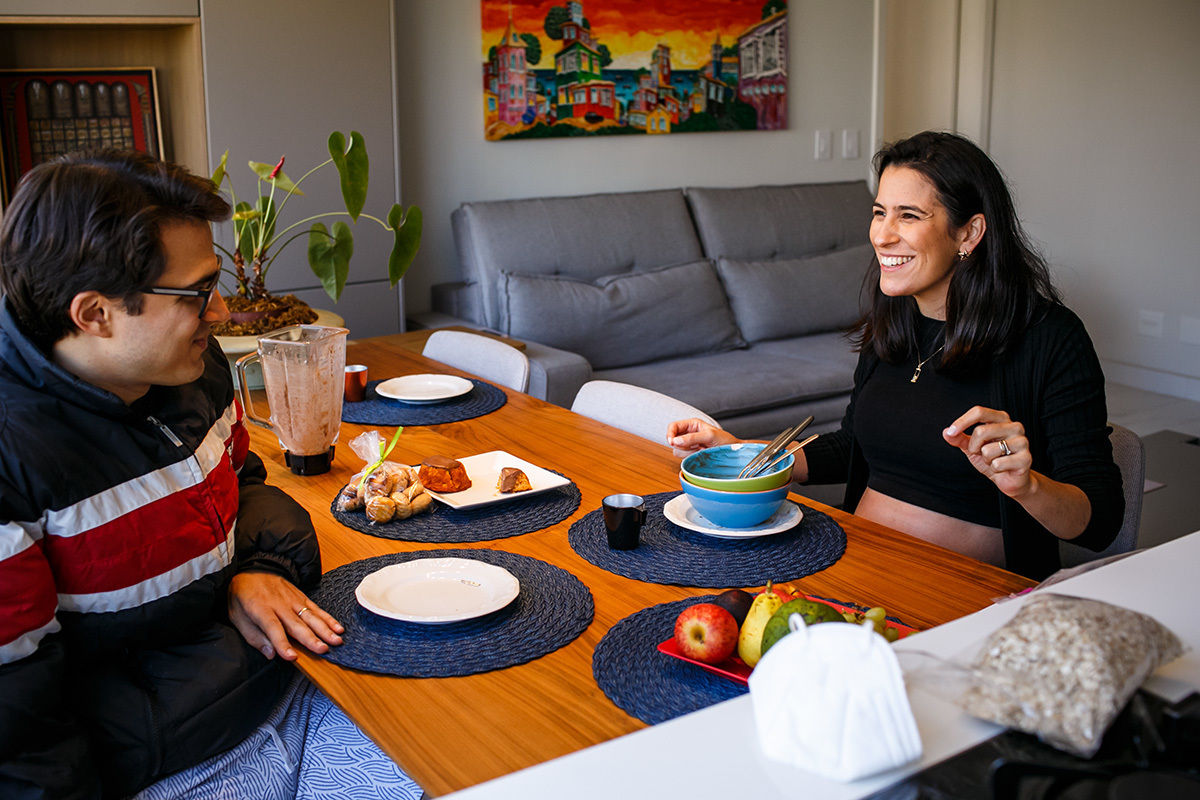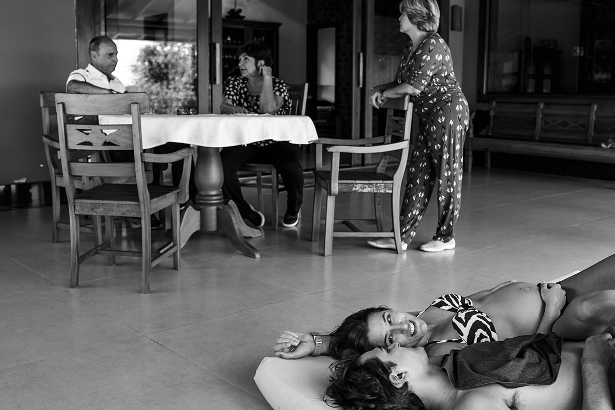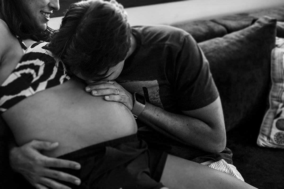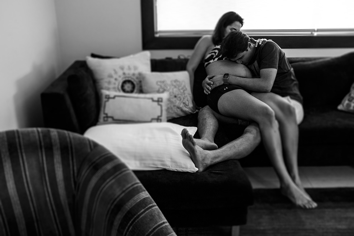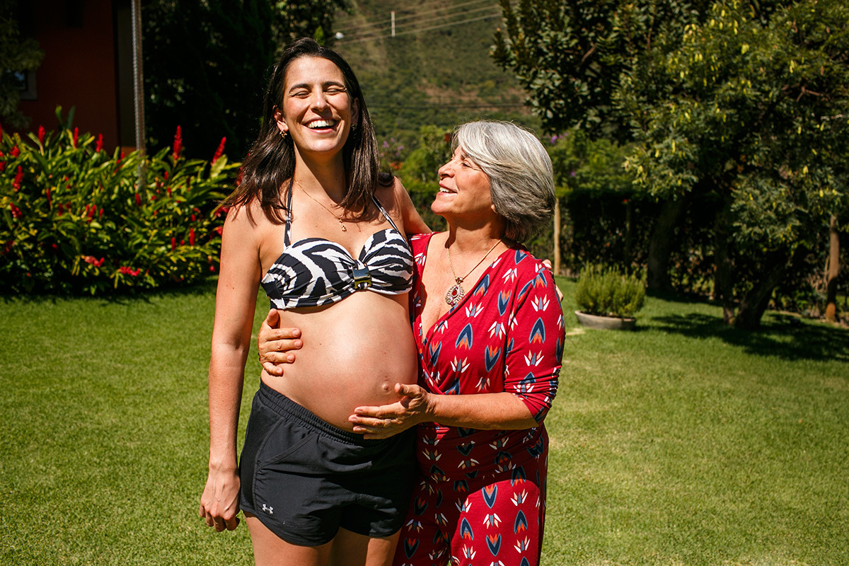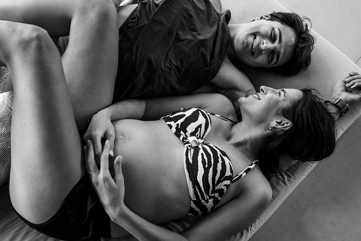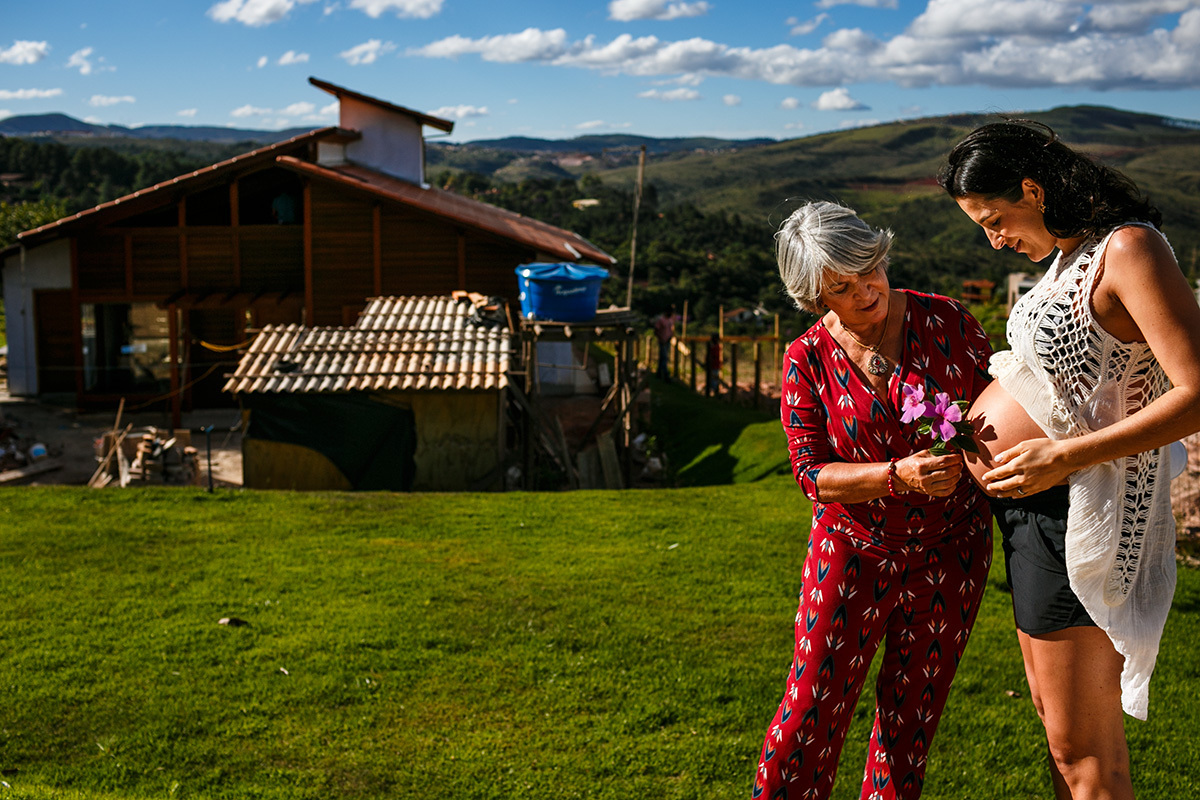 Não me preocupo muito com poses perfeitas, mas sim em deixar para a família um pouco de como eles são, do que eles gostam e de como se sentiam neste momento, para que possam olhar para essas imagens e se reconhecerem nelas. Mostrar para essa menininha que está chegando como seus pais adoram se abraçar. Como eles adoram curtir a varanda da casa deitados no colchonete, ali mesmo, no chão. Como se enroscavam no sofá para lhe contar um segredo. Como sua mãe sorri até com os olhos só de se aproximar do seu pai. Mostrar para essa menininha que está chegando o grande amor que seus pais e seus avós já sentiam por ela quando ainda estava dentro da barriga. Mostrar para ela que muito do que importa está nestes momentos simples da vida.