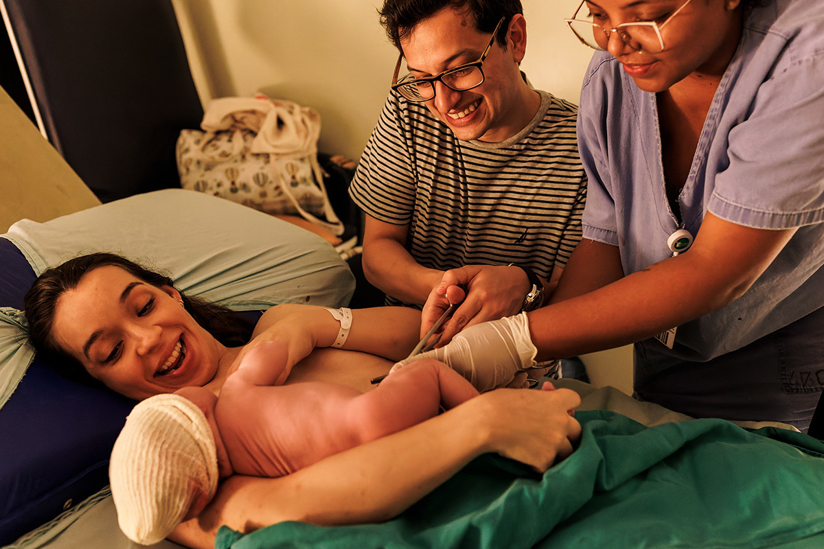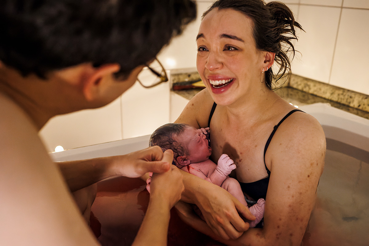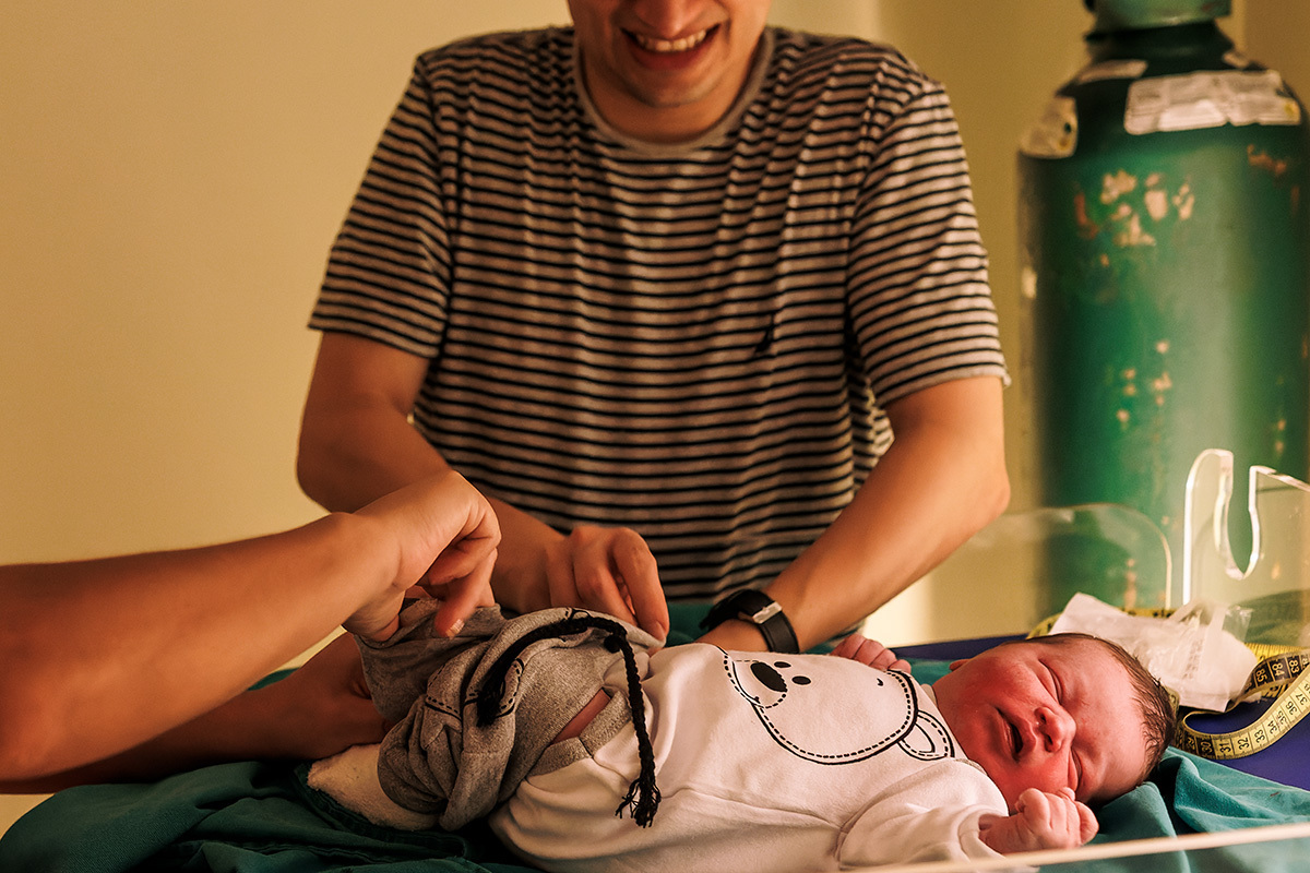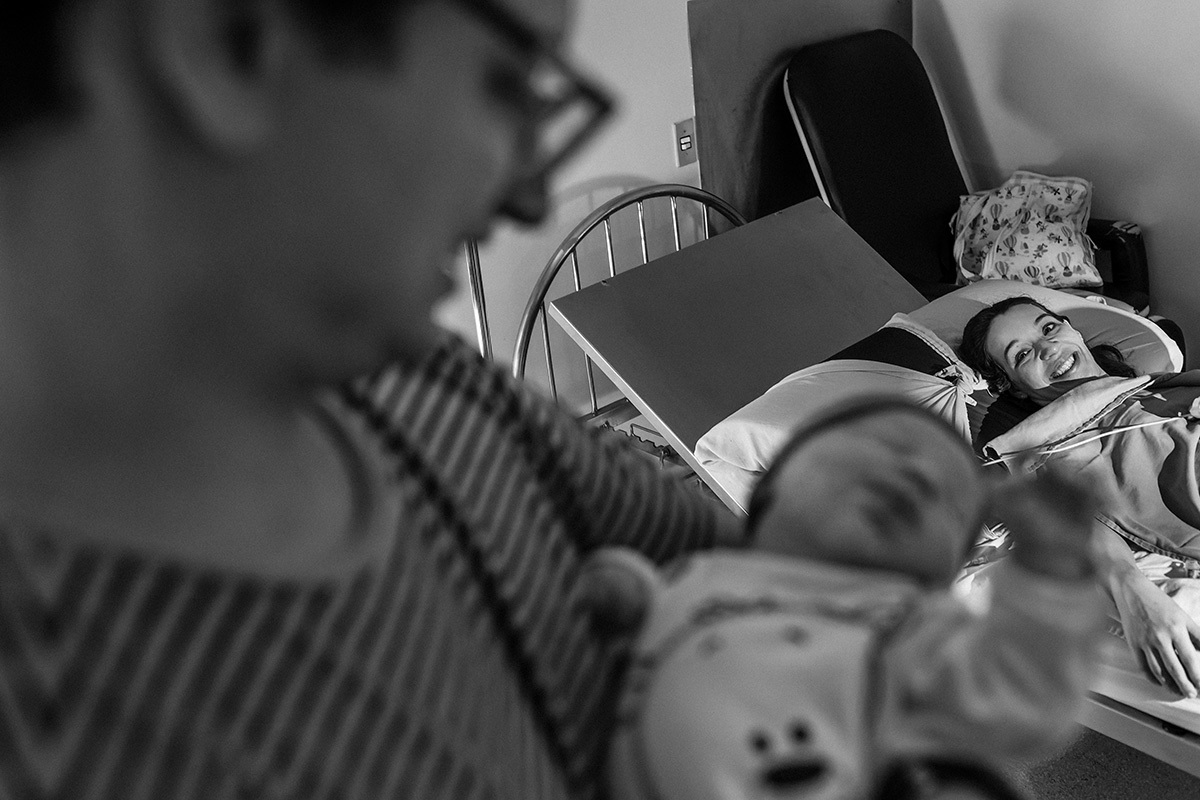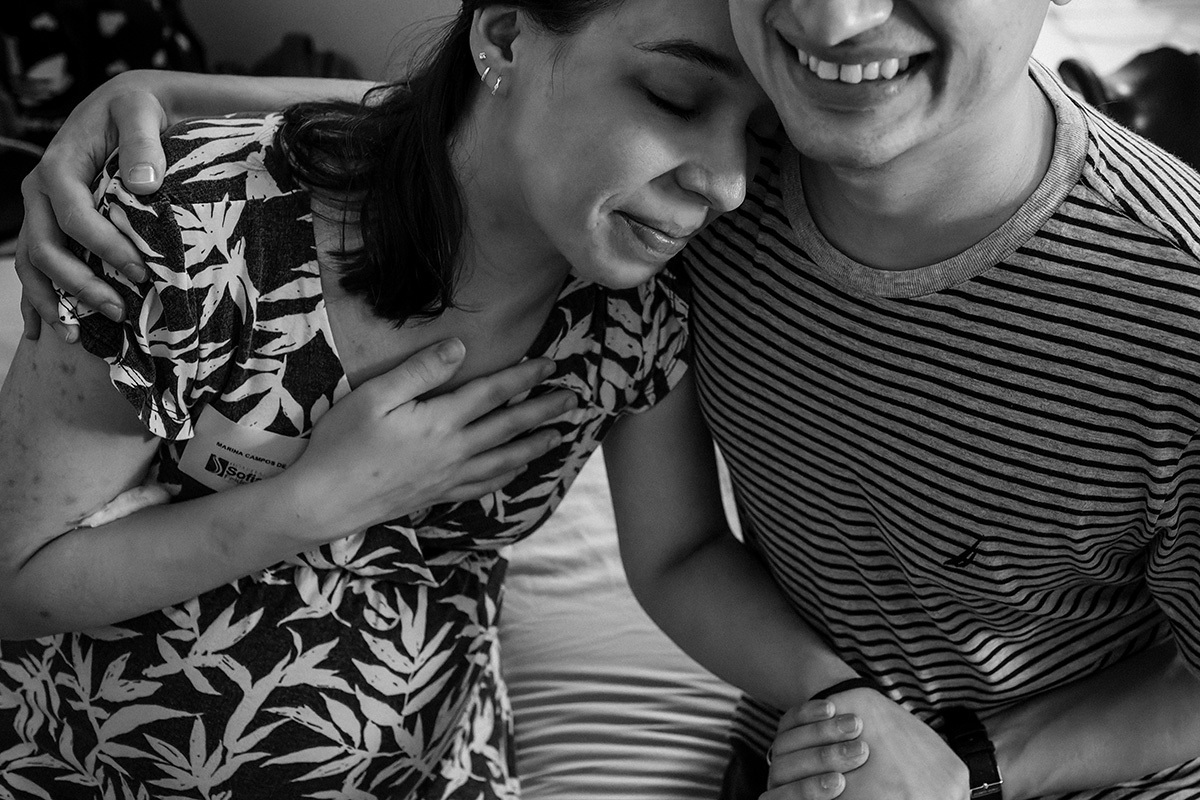 Comecei a acompanhá-los ainda em casa um pouquinho antes de saírem para a maternidade, onde a Marina quis permanecer o máximo que podia. Lá, pôde ficar ao lado do filho e de sua mãe, e contou com a assistência da enfermeira obstetra, Gabrielle, e da sua doula, Gizeli. Ela estava tão tranquila que quando partimos para a maternidade, já com 9 cm de dilatação, era só sorrisos entre as ondas de contrações, as quais as contornava com uma respiração lenta e profunda.