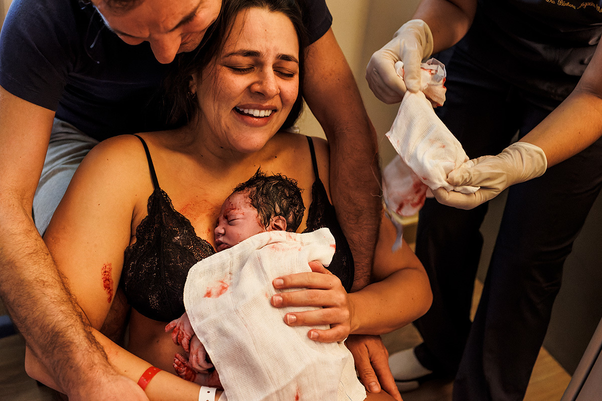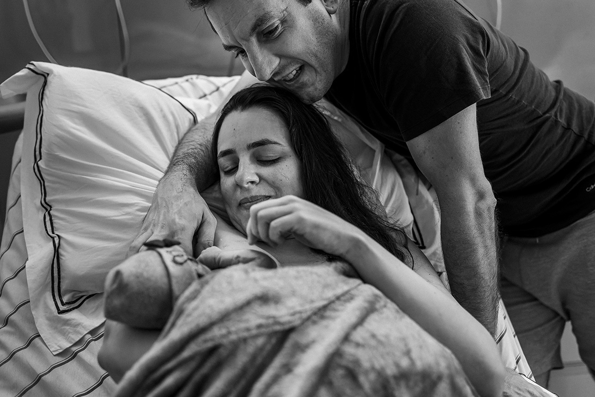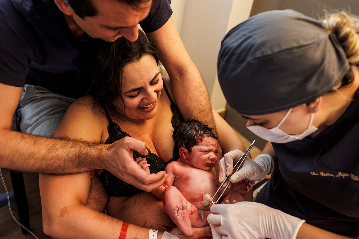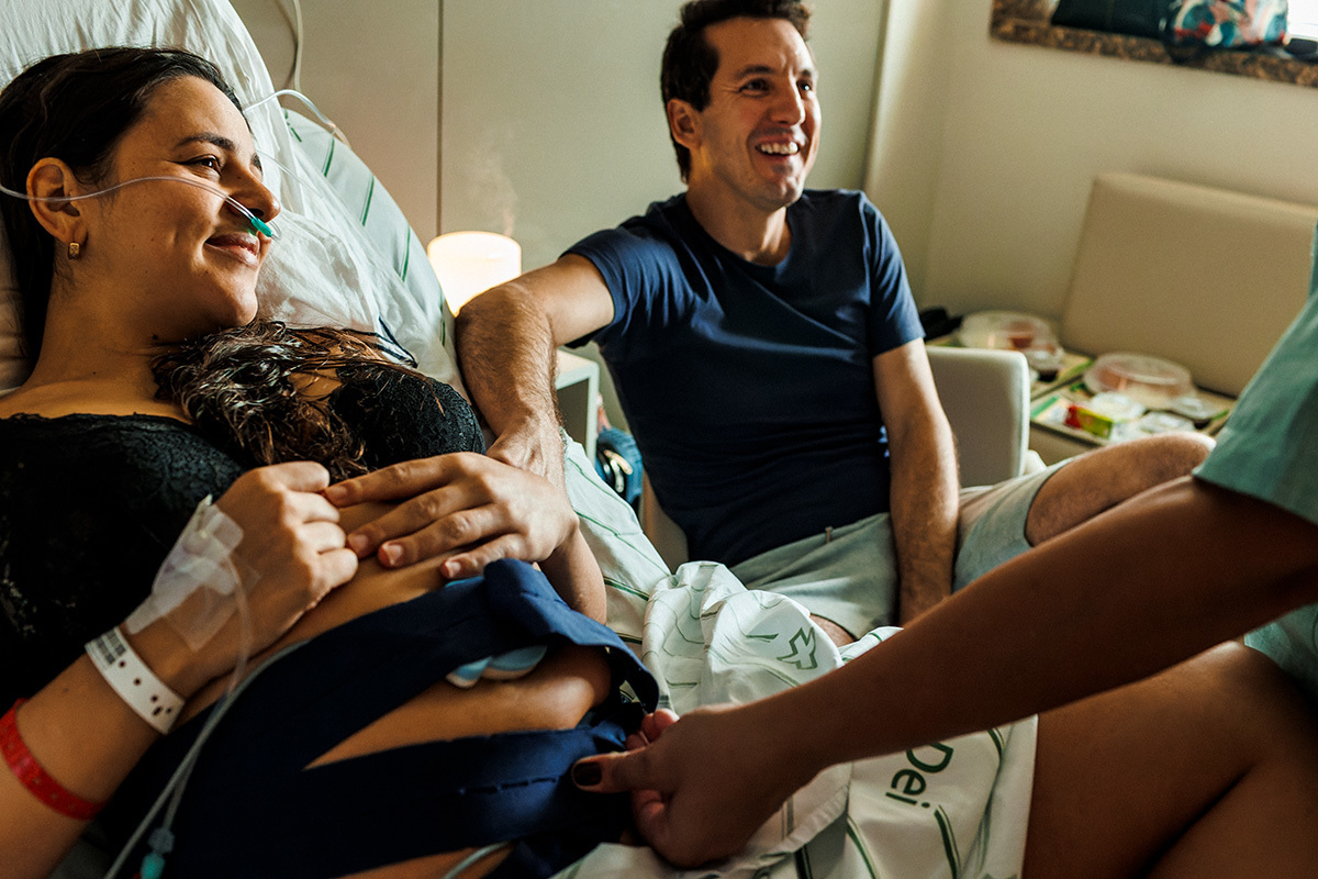 No dia do parto, quando me chamaram para começar a acompanhá-los, a Ju estava sendo preparada para receber analgesia para aliviar as dores das contrações ao seu pedido. Ela descansou um pouquinho e logo depois entrou na fase expulsiva. Nessa hora ela relaxou e se entregou a emoção do momento! Sorria leve, entregue a esse prazer! O Matías era puro sentimento, seus olhos se enchiam de água a toda hora tamanha a emoção que tinha no peito!