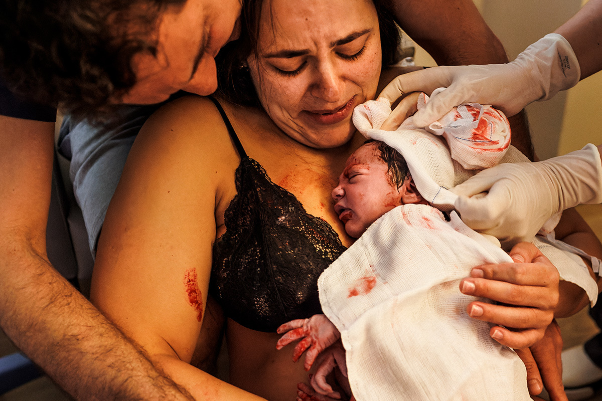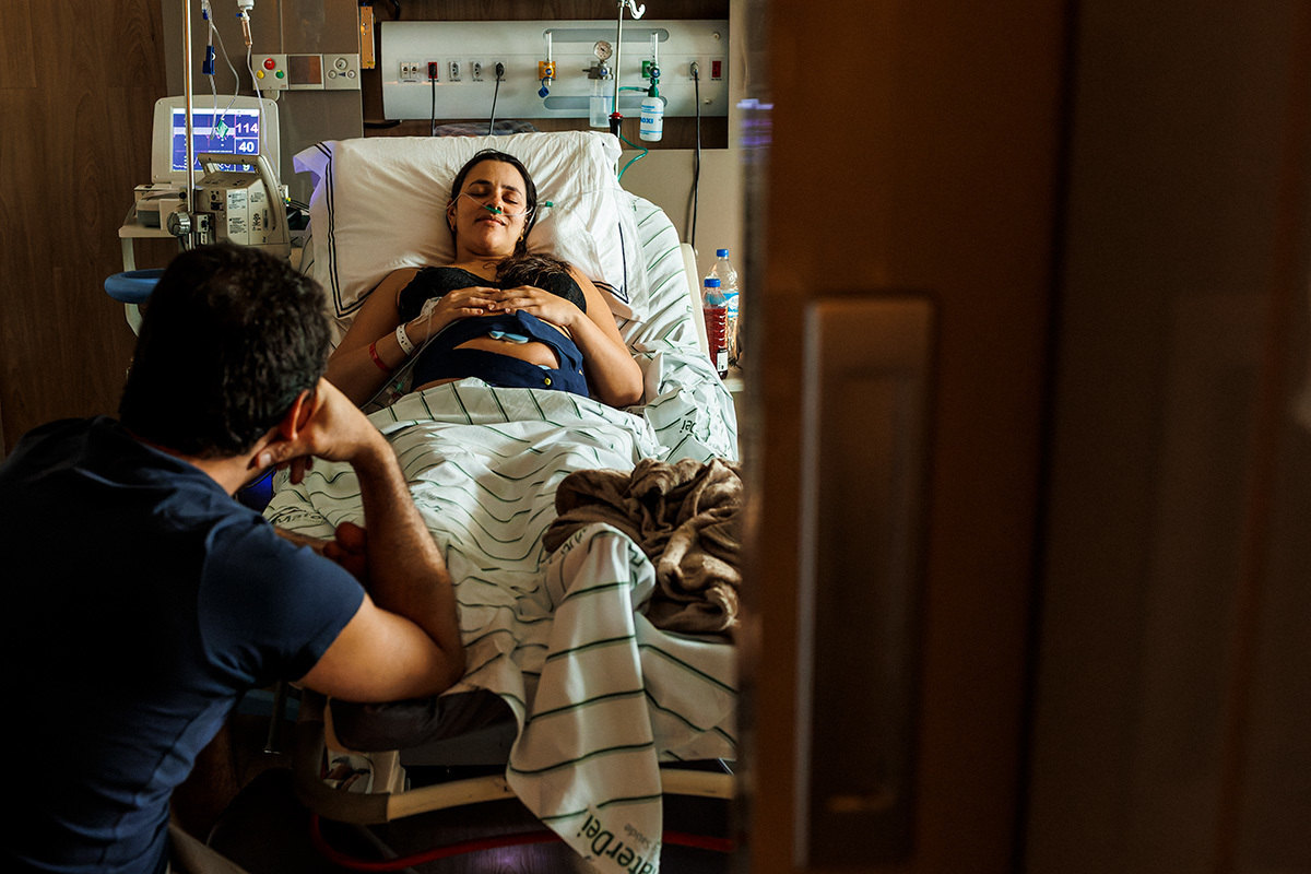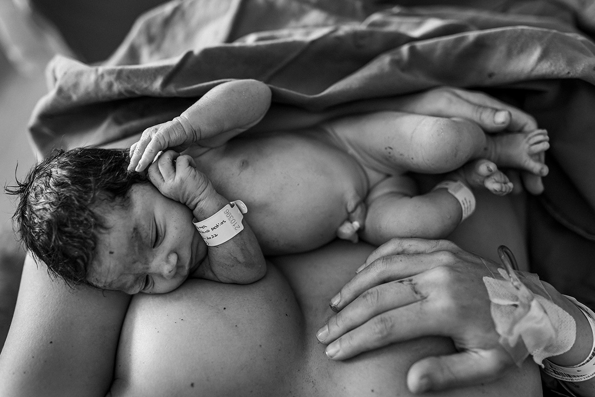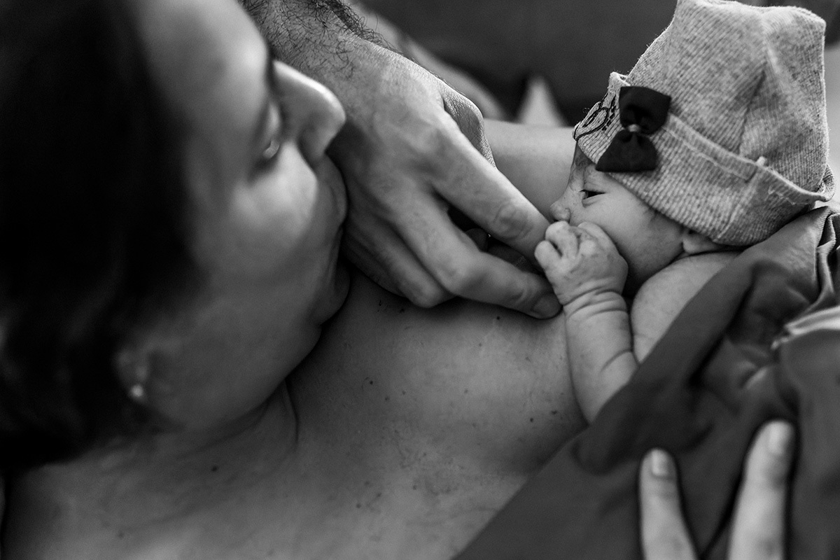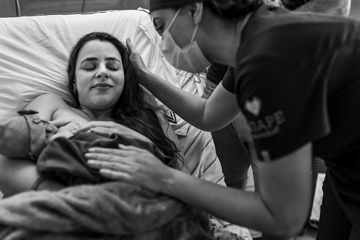 No dia do parto, quando me chamaram para começar a acompanhá-los, a Ju estava sendo preparada para receber analgesia para aliviar as dores das contrações ao seu pedido. Ela descansou um pouquinho e logo depois entrou na fase expulsiva. Nessa hora ela relaxou e se entregou a emoção do momento! Sorria leve, entregue a esse prazer! O Matías era puro sentimento, seus olhos se enchiam de água a toda hora tamanha a emoção que tinha no peito!