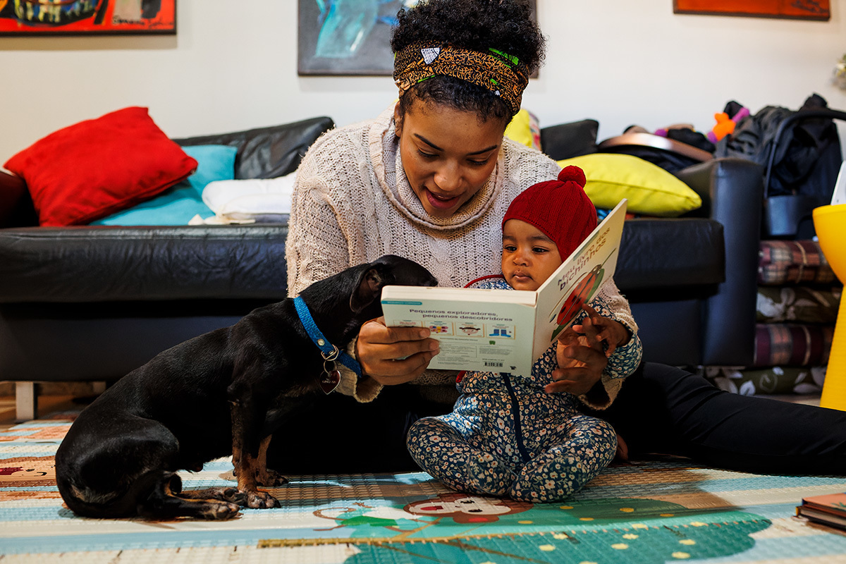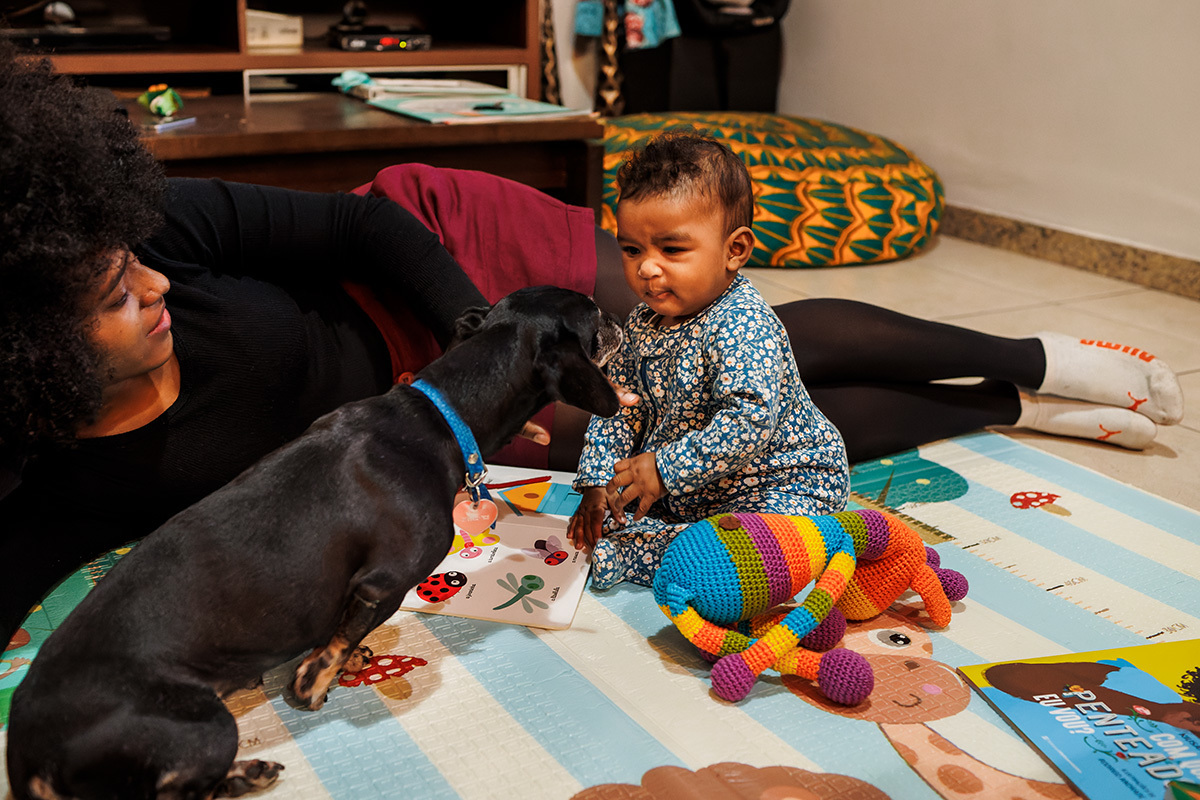 Que delícia foi registrar as novidades dessa menina linda de sorriso fácil! Está super ágil, capaz de se arrastar no chão para ir em busca de algo que deseja e atenta a tudo, demonstrando grande interesse ao que lhe é apresentado. Dos livros, então, nem se fala, já é uma grande apreciadora! Na verdade, acho que ela e a Frida, a cachorrinha da família!