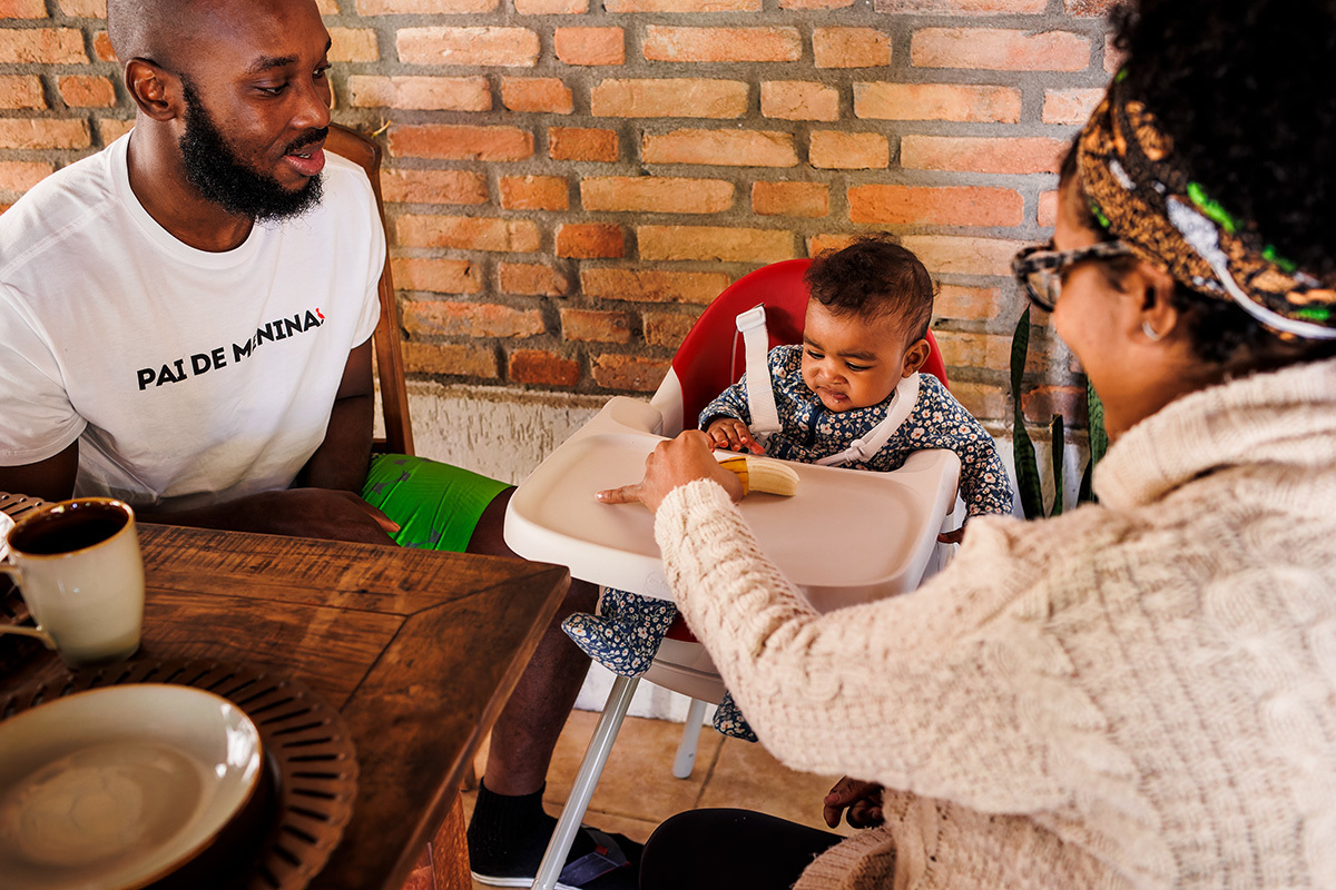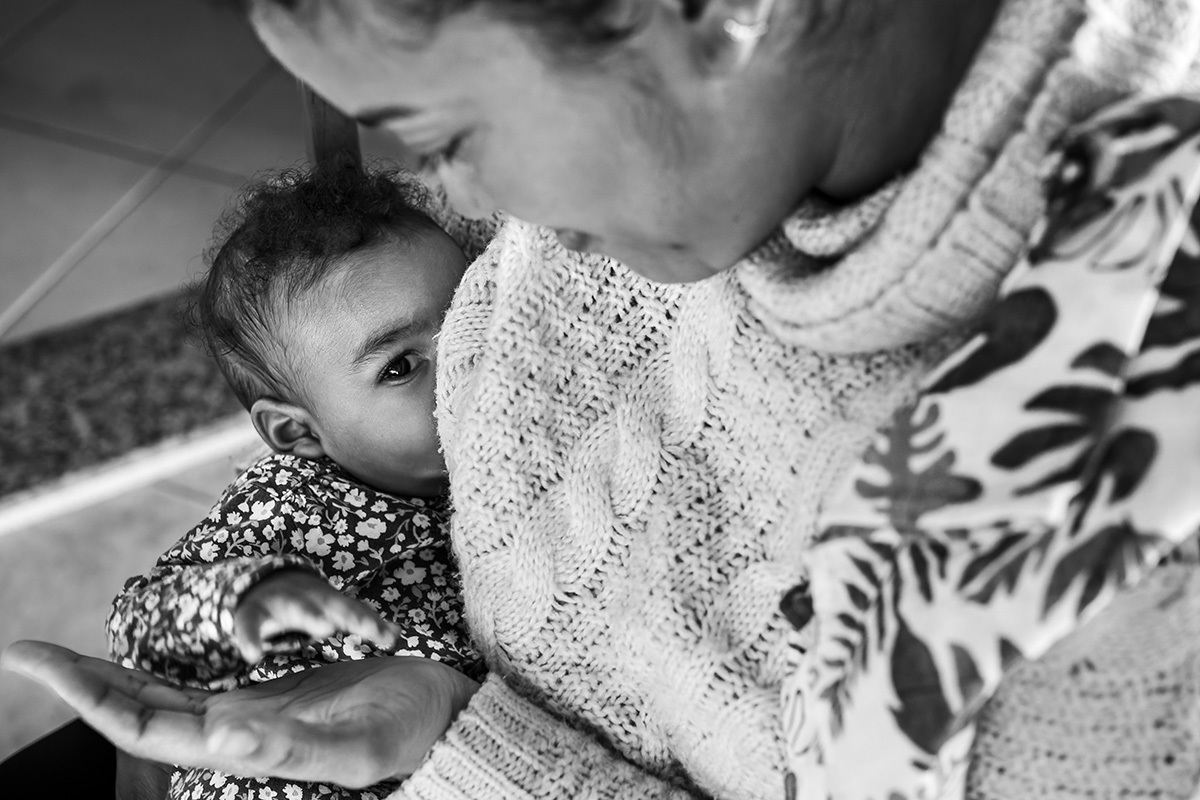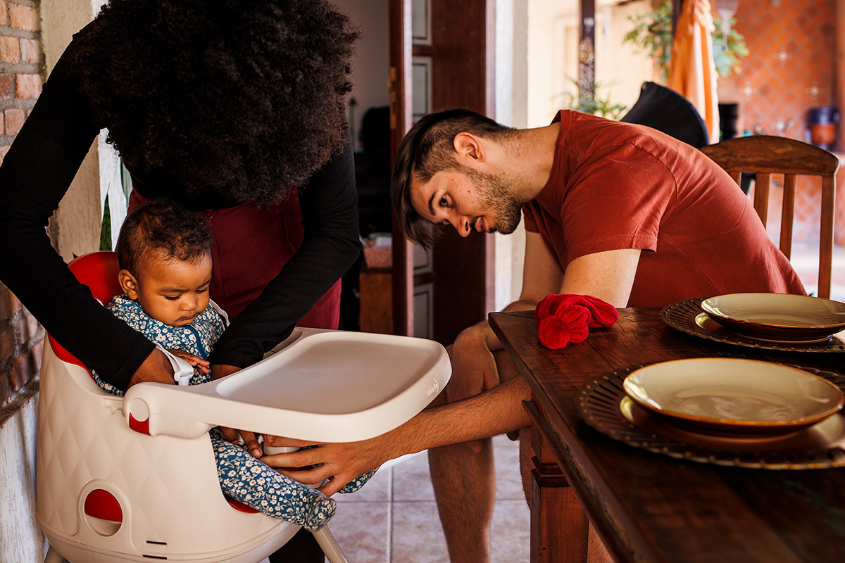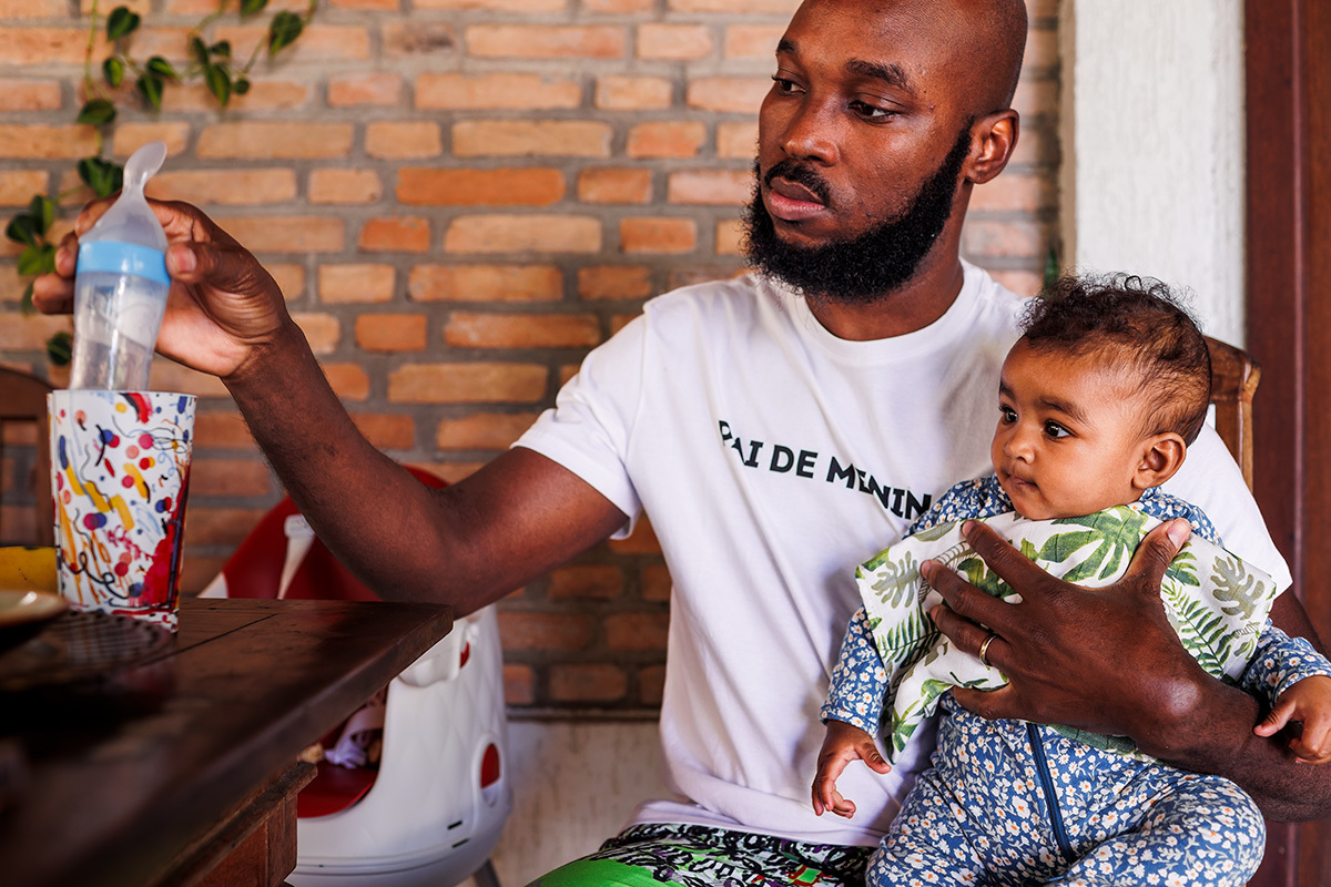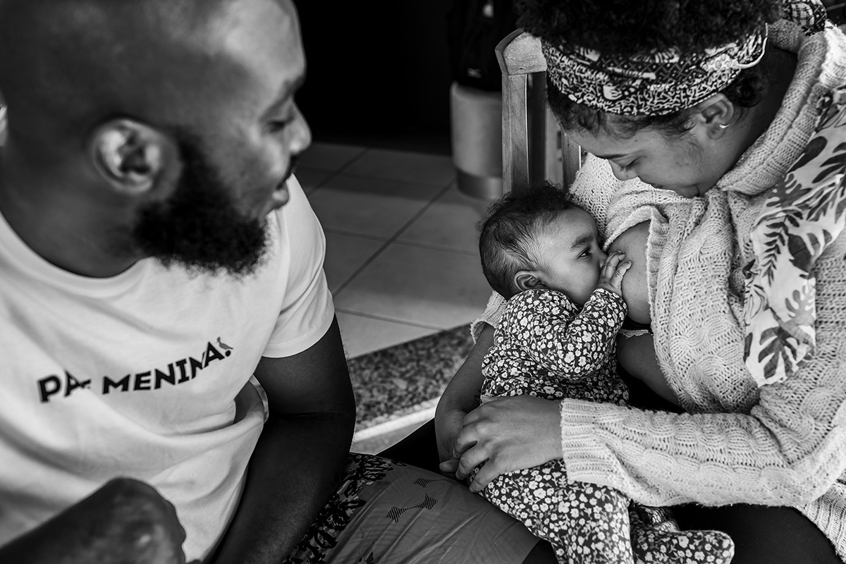 A May, que é obstetra, voltou a trabalhar quando a Odara estava prestes a completar 2 meses. Para que a Odara permanecesse com o aleitamento exclusivo até os 6 meses ela retirava o seu leite e deixava estocado para que o Mathias pudesse dar a Odara na colherzinha nos dias em que trabalhava. Esse empenho dos dois foi muito importante e deu super certo! Por isso, a May fez questão que eu registrasse o Mathias, pelo menos uma vez, dando a Odara o leite materno na colherzinha. Apesar de estar presente e poder ali, naquele instante amamentar, ela deixou que o Mathias o fizesse porque queria muito ter a lembrança desse ato de amor que lhes foi tão essencial.