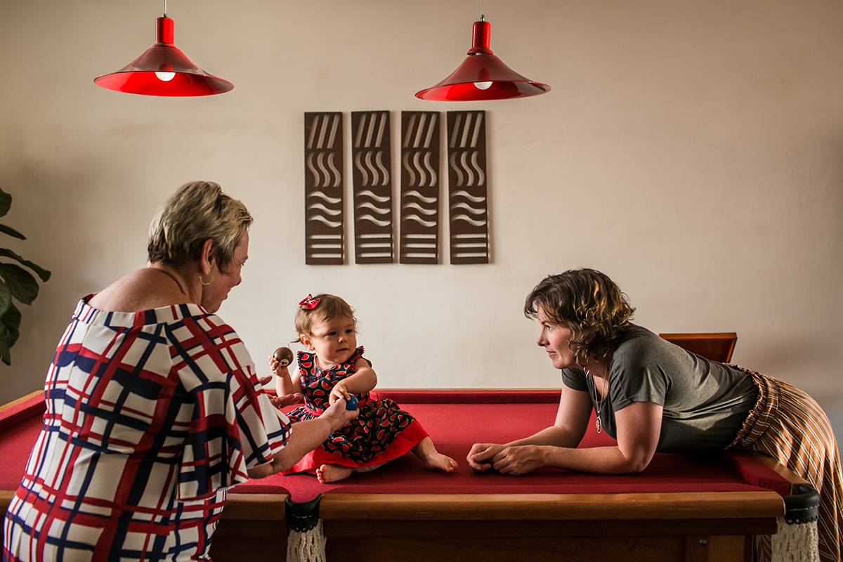 Bebê comendo milho e dando risada sobre uma mesa de sinuca junto a sua avó e bisavó, por Adriana Costa