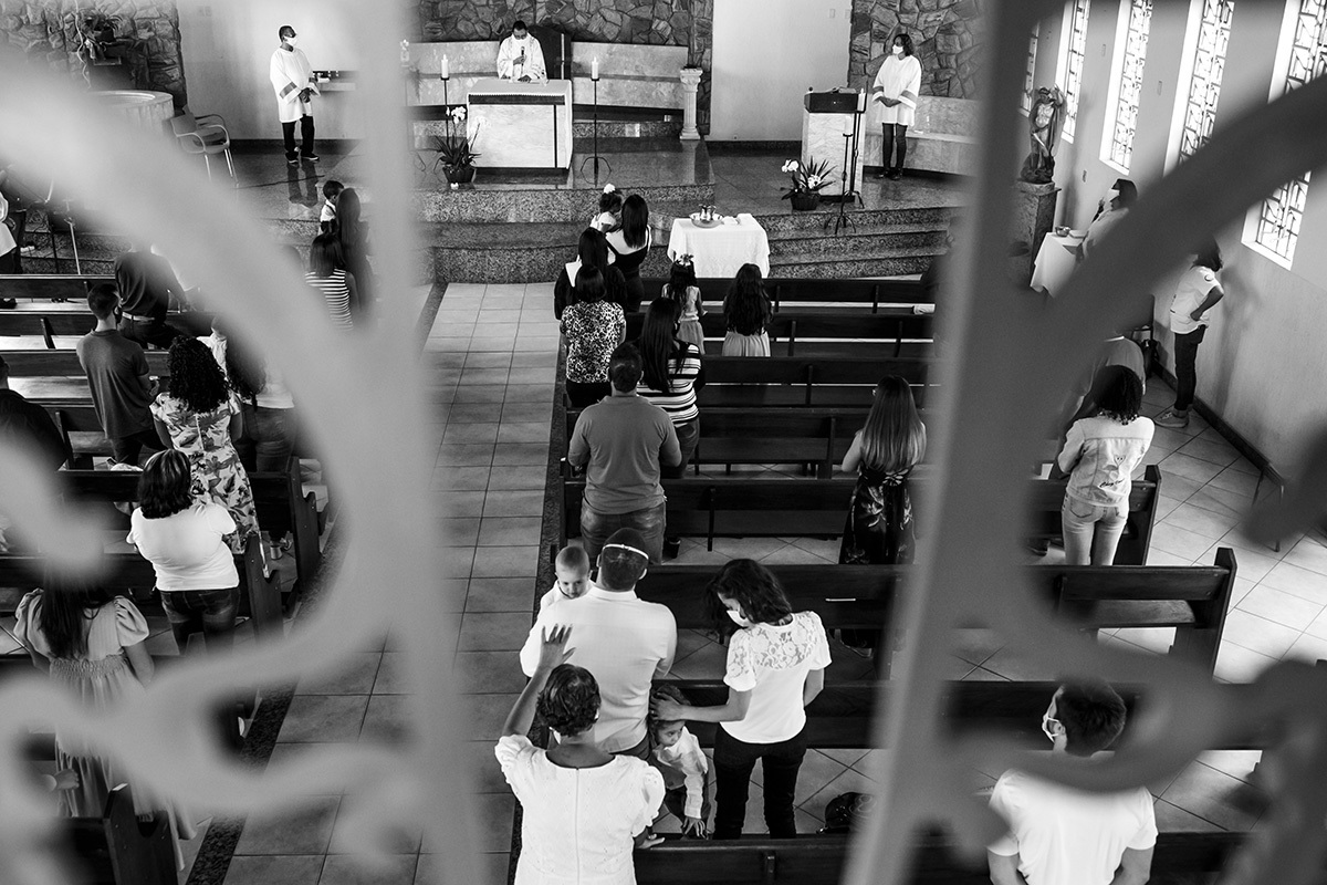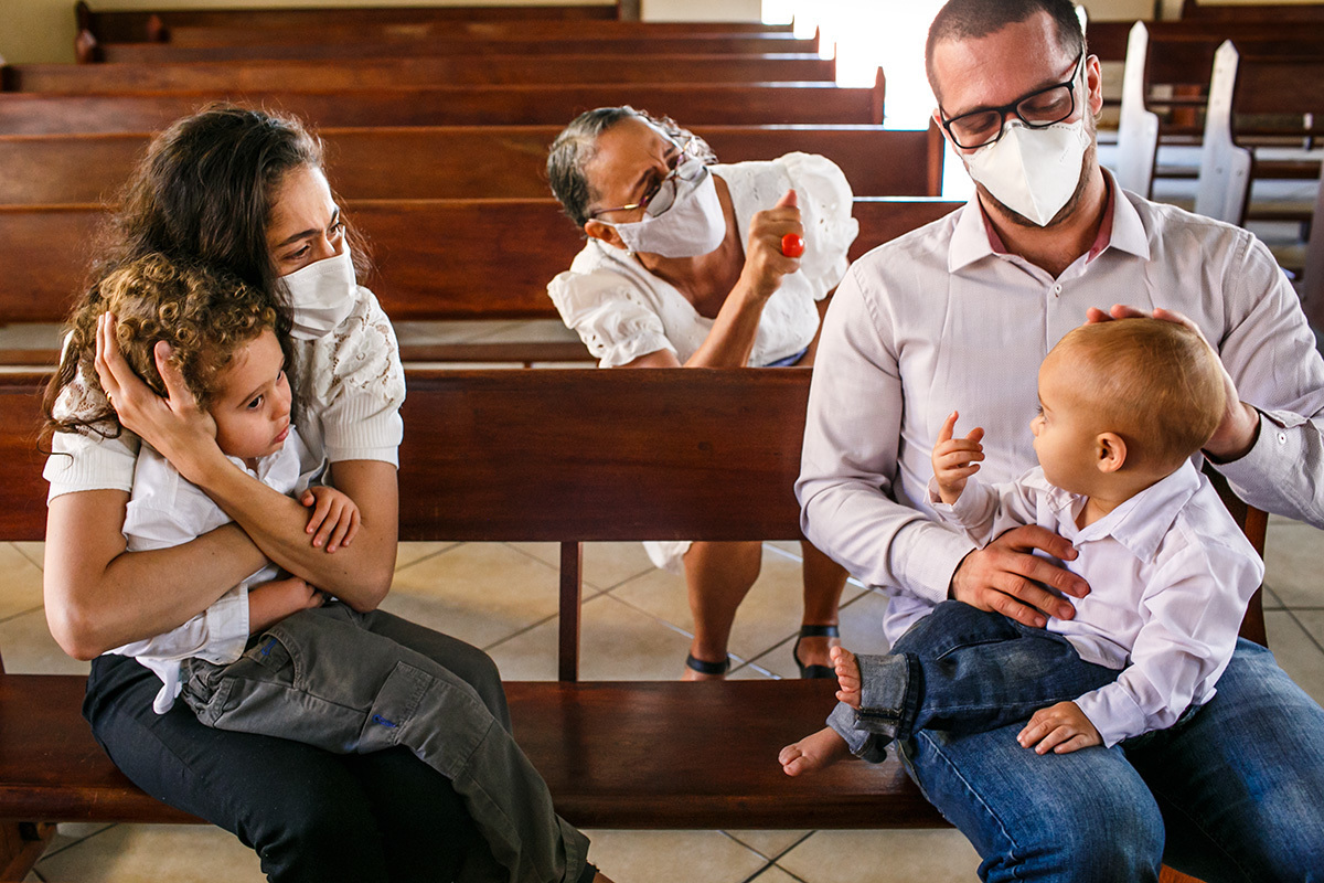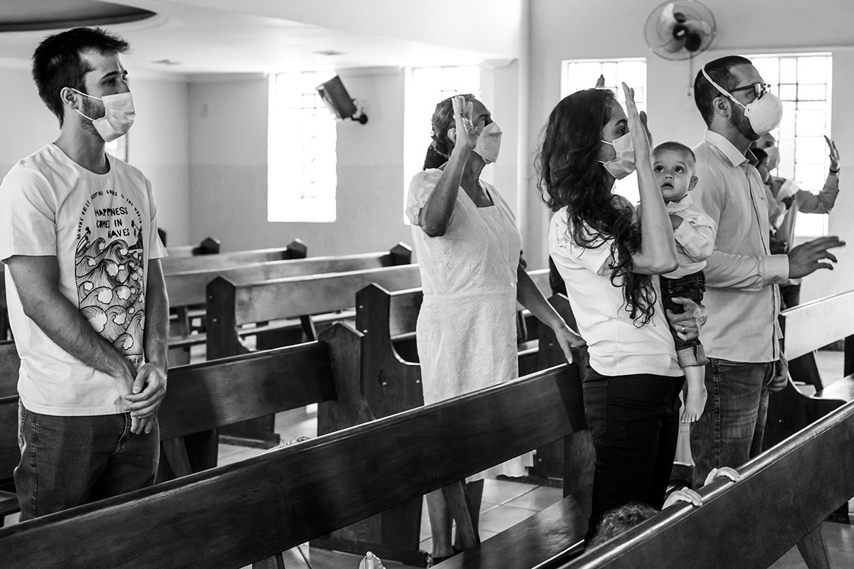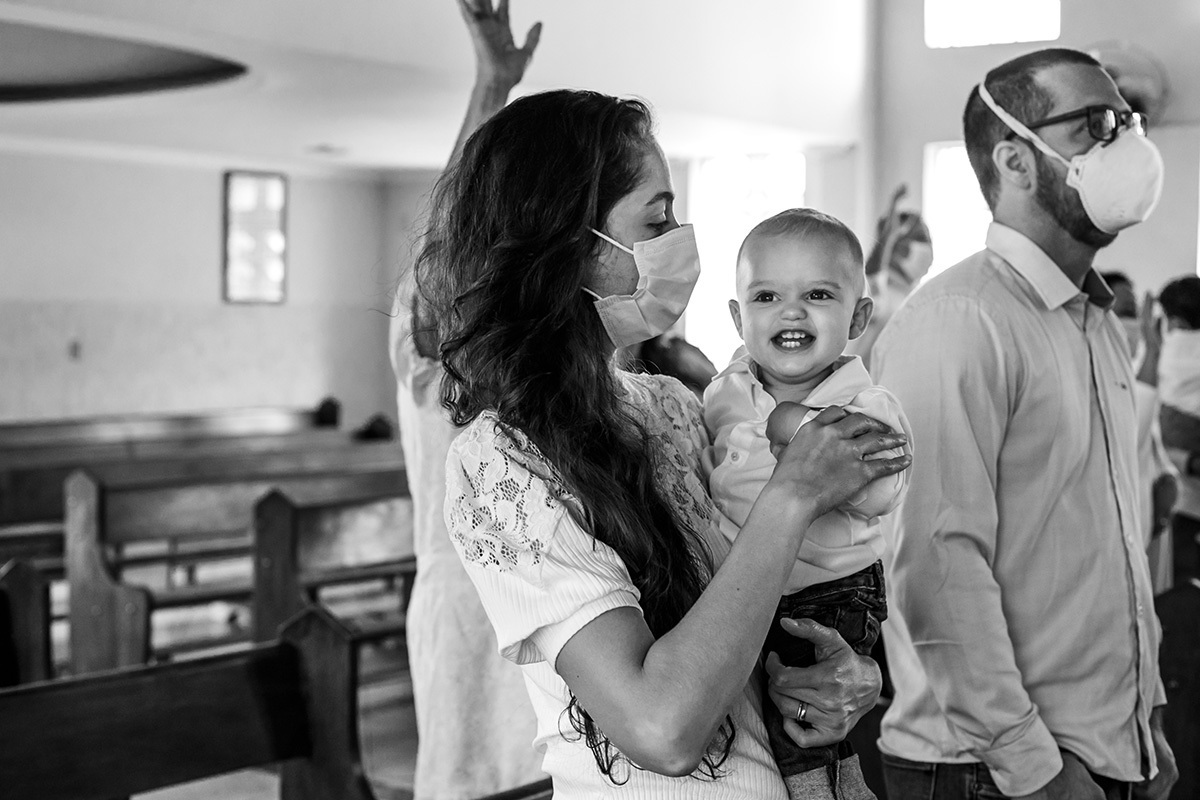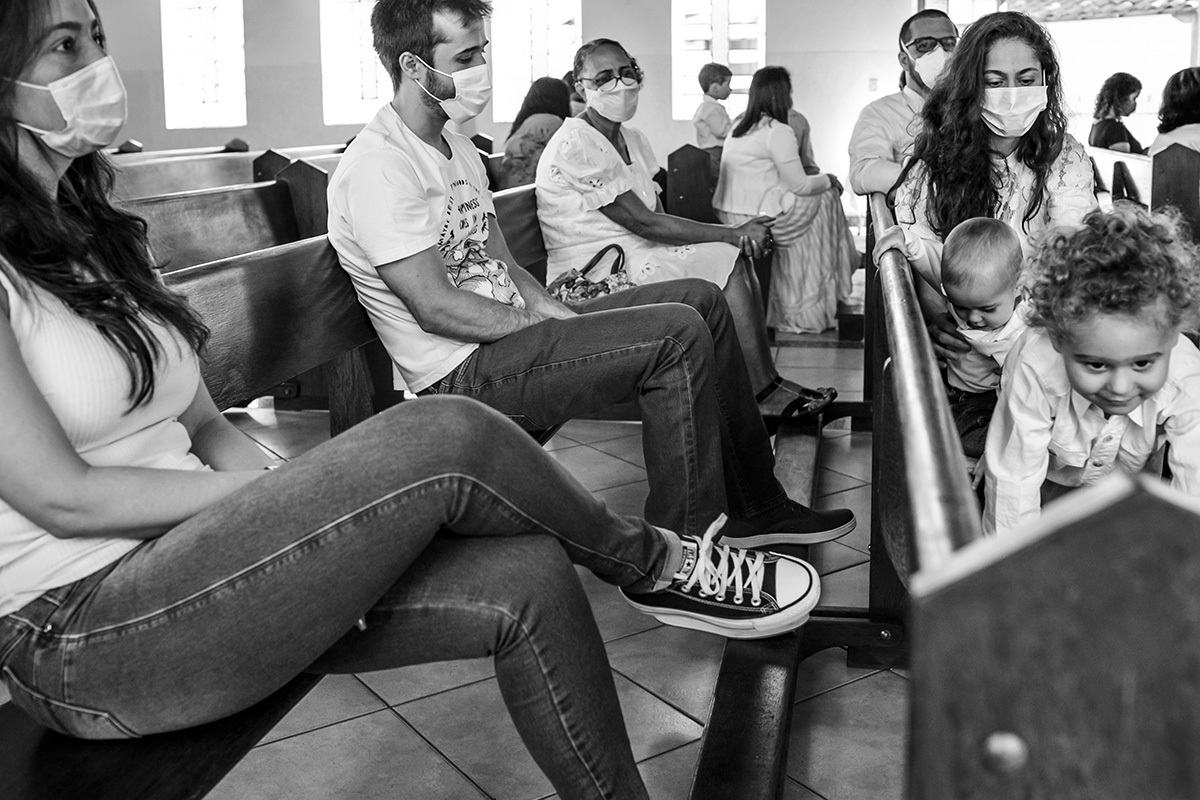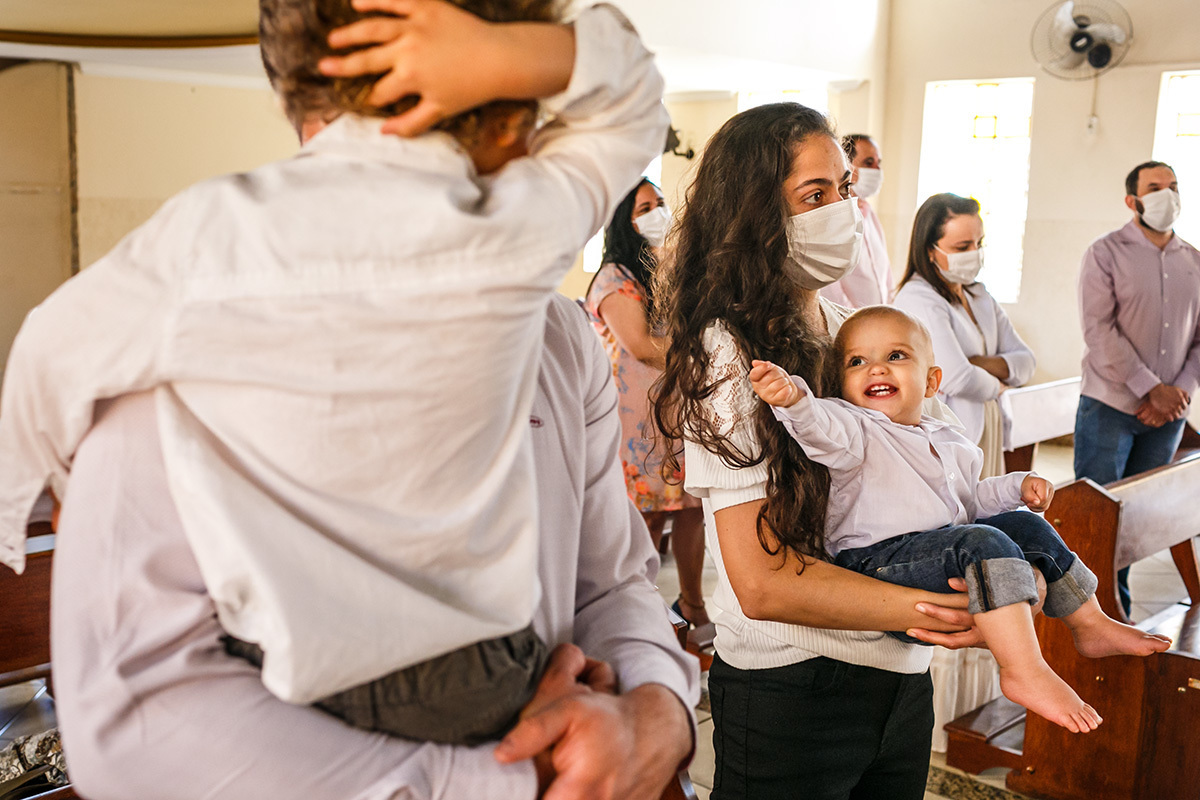 menino observa mãe rezando na missa de batismo do caçula em foto de Adriana Costa