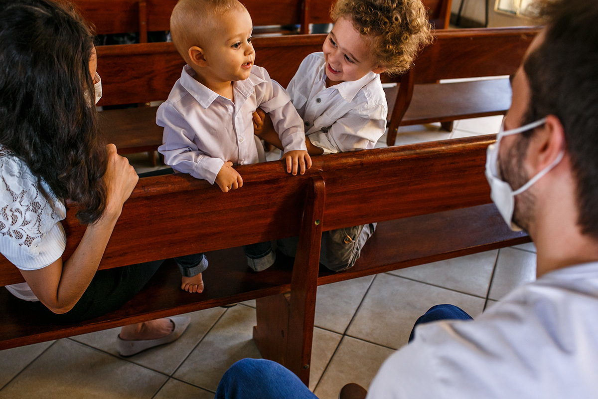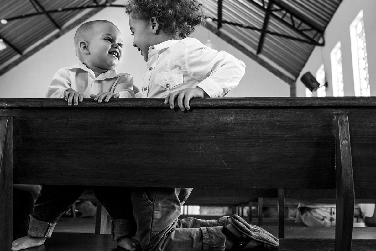 irmãos brincam animados durante a cerimônia de batismo em foto de Adriana Costa