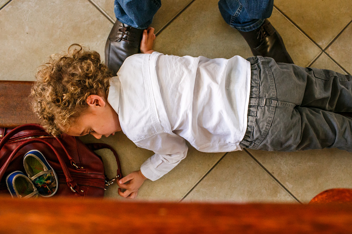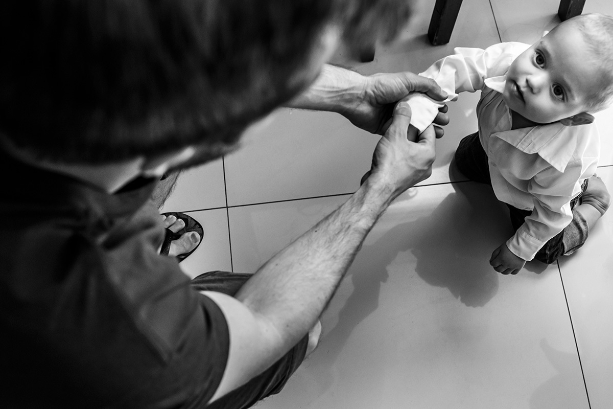 pai ajuda calçando os sapatos nas crianças em foto de Adriana Costa