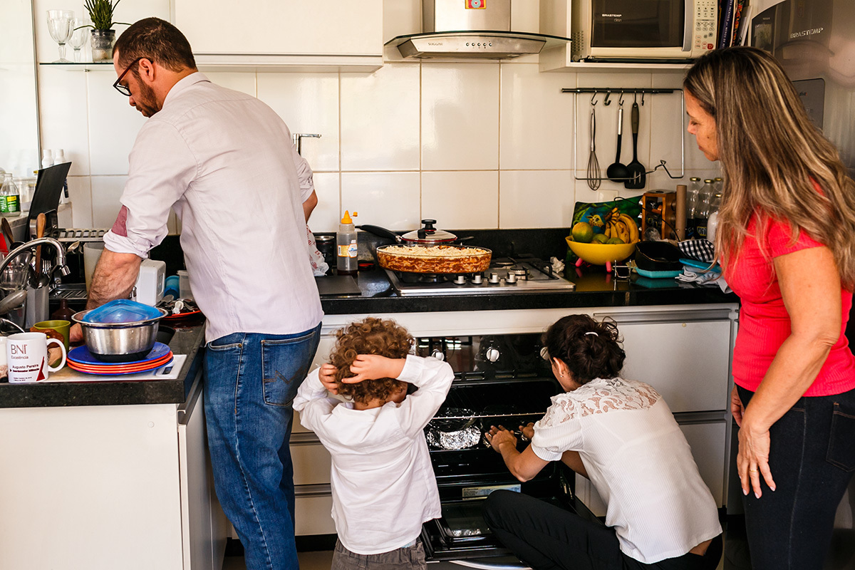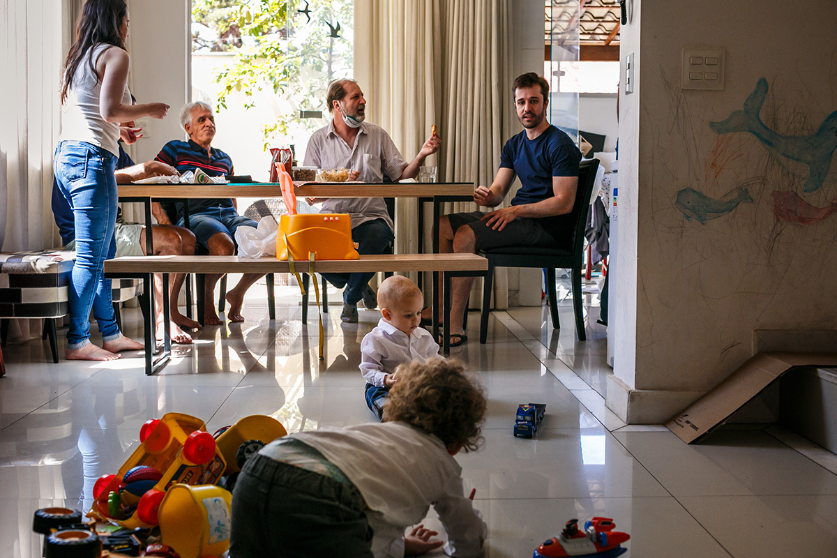 irmãos brincam em casa durante o almoço para comemorar o batizado do caçula