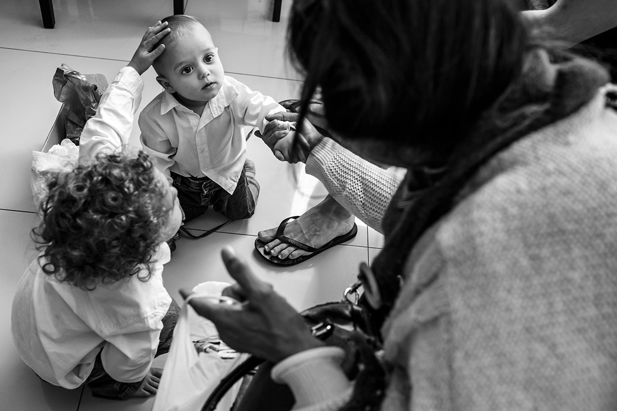 enquanto a mãe amamenta o caçula durante a missa de batismo seu filho mais velho deita no seu colo e brinca com os pés do irmão em foto de Adriana Costa
