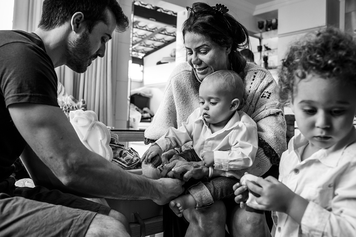 Foto de Adriana Costa do carinho entre irmãos durante o batizado do caçula