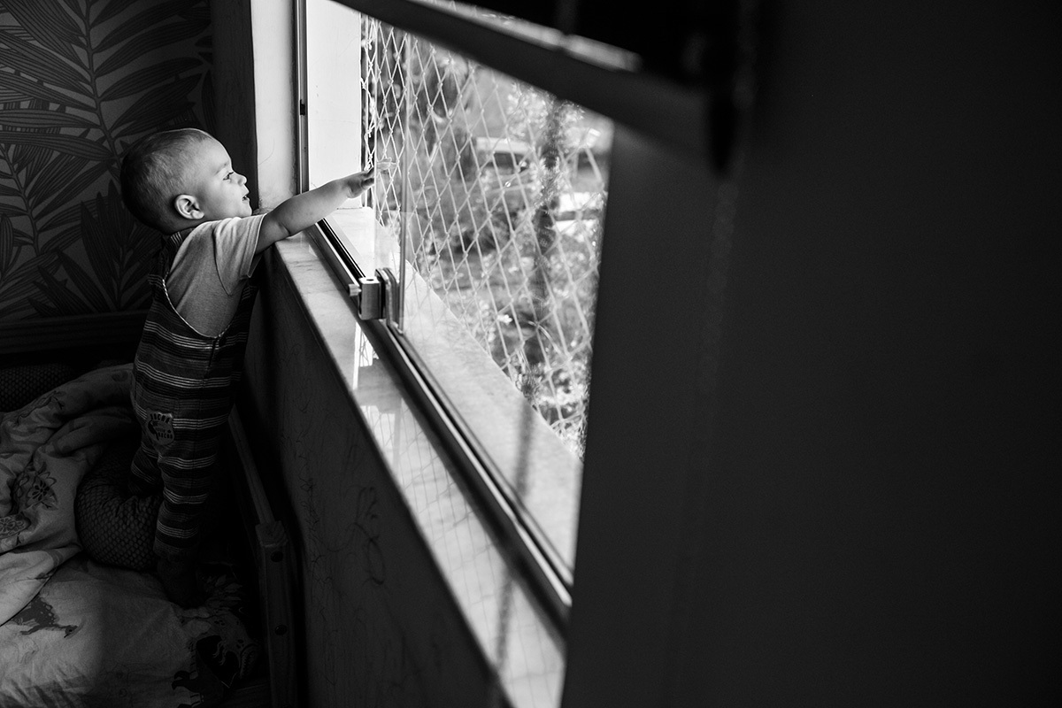 bebê fica na ponta dos pés em sua cama para olhar a janela